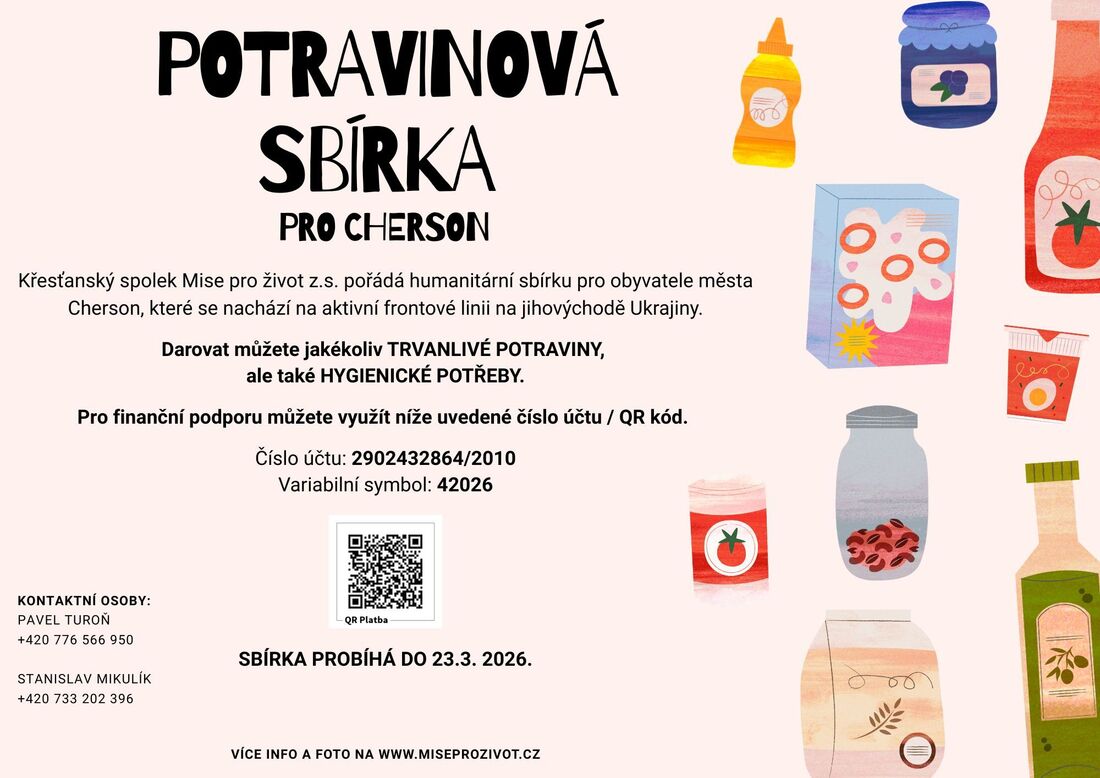 Náš sbor se opět připojuje ke sbírce pro obyvatele Ukrajinského Chersonu. Darovat je možné trvanlivé potraviny a hygienické potřeby, příp. lze přispět finančně. Sběrným místem je naše fara.