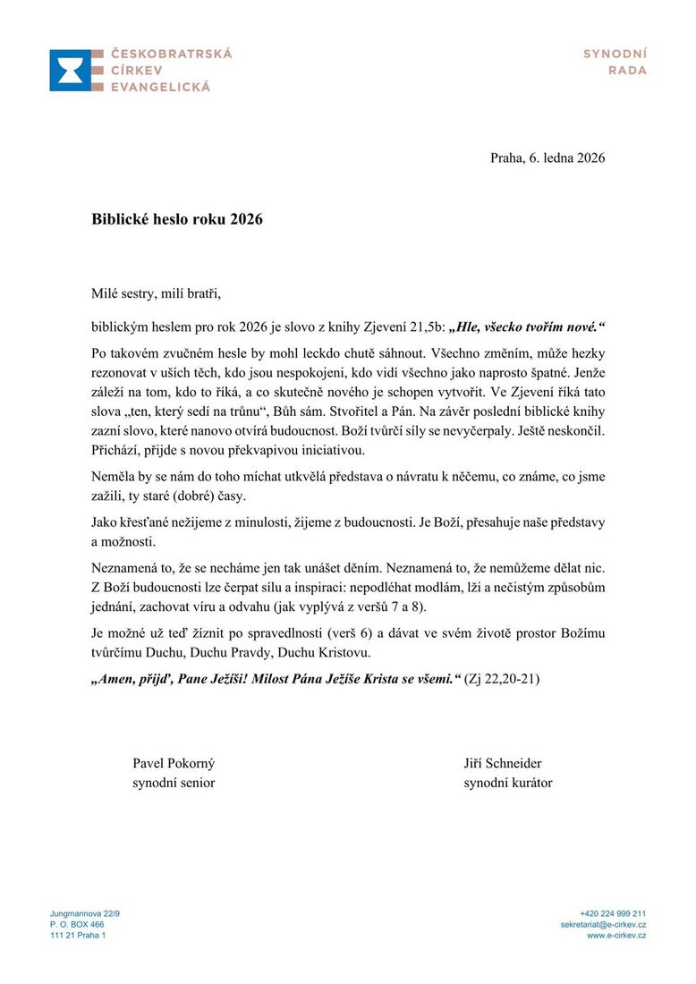 Biblickým heslem pro rok 2026 je slovo ze Zjevení 21,5b: „Hle, všecko tvořím nové.“