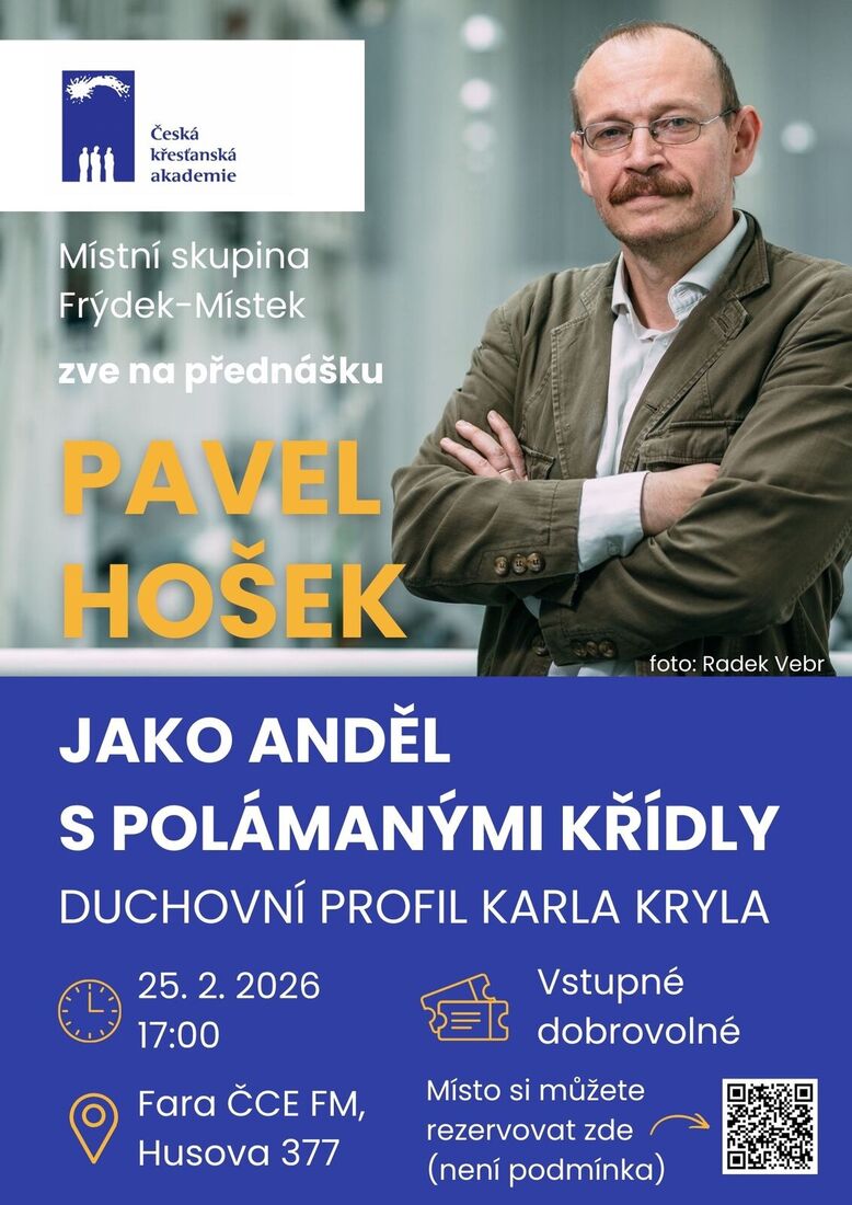 Zveme vás na první akci nové Místní skupiny České křesťanské akademie, jíž bude přednáška prof. Pavla Hoška o duchovním profilu Karla Kryla u nás na faře 25. února od 17:00. Vstupné dobrovolné.