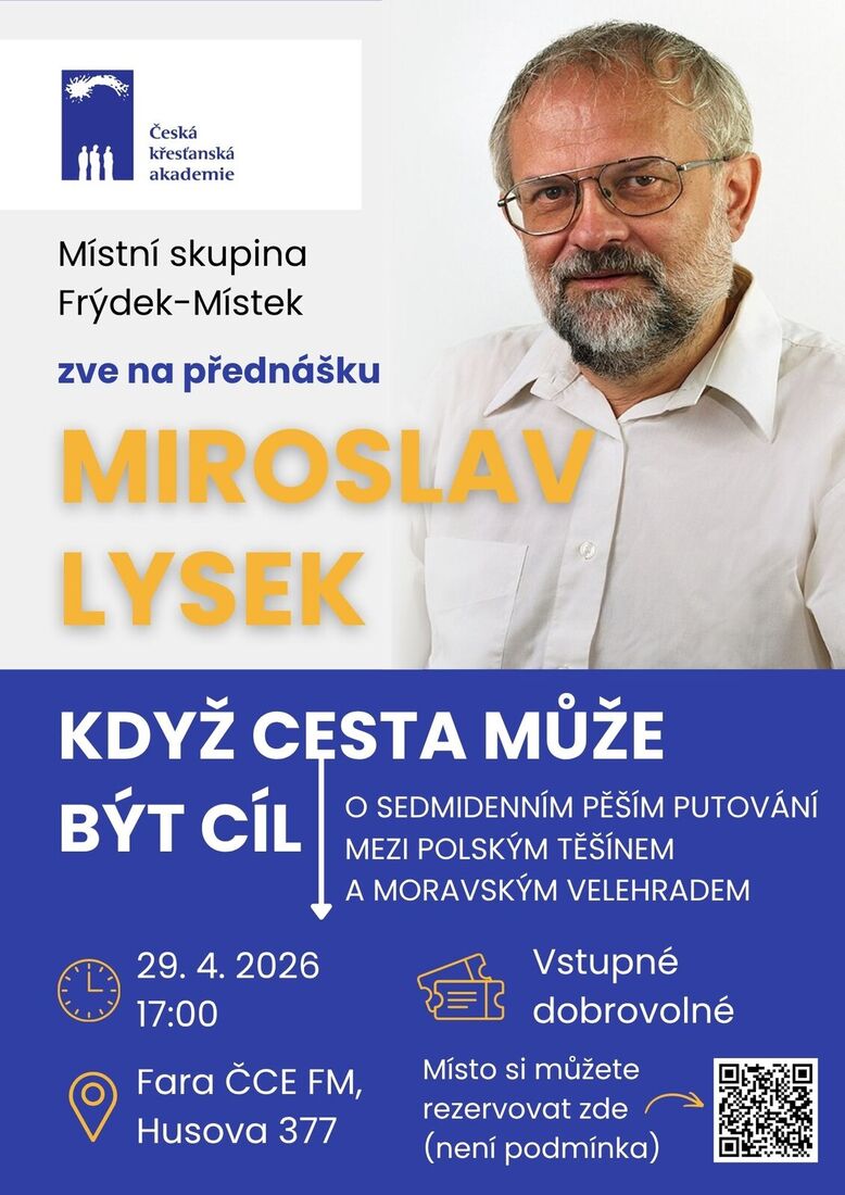 Místní skupina České křesťanské akademie vás zve na přednášku Miroslava Lyska o pěším putování mezi Cieszynem a Velehradem.
